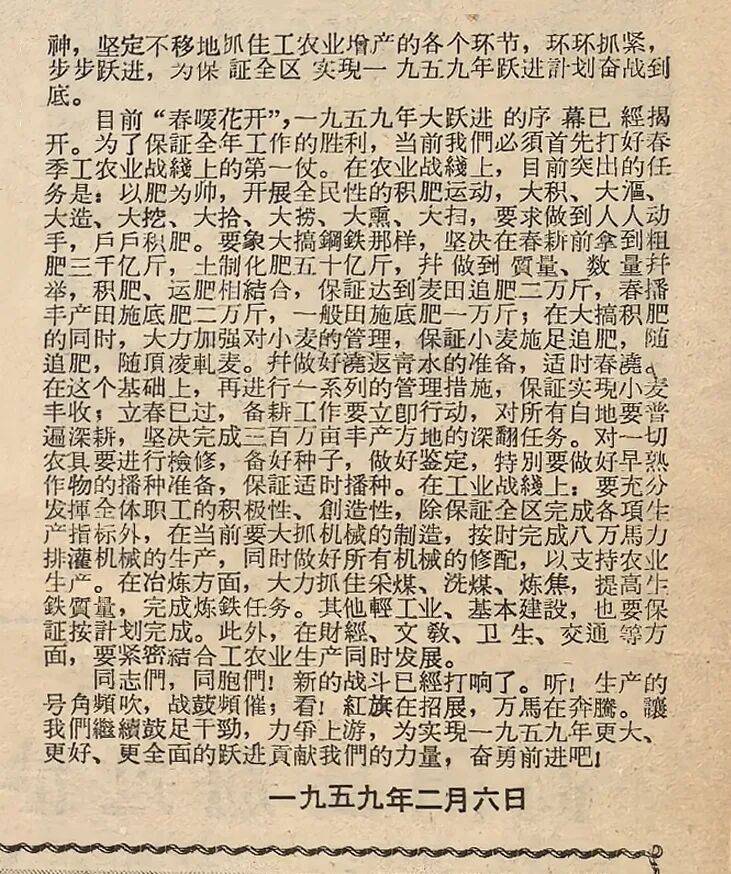 目前 “春暖花开”,一九五九年的序幕已经揭开。为了保证全年工作的胜利,当前我们必须首先打好春季工农业战线上的第一仗。在农业战线上,目前突出的任务是:以肥为师,开展全民性的积肥运动,大积、大沤、大造、大挖、大抬、大捞、大熏、大扫,要求做到人人动手,户户积肥。要象大搞钢铁那样,坚决在春耕前拿到粗肥三千亿斤,土制化肥五十亿斤,并做到质量、数量并举,积肥、运肥相结合,保证达到麦田追肥二万斤,春播丰产田底肥二万斤,一般田底肥底一万斤;在大搞积肥的同时,大力加强对小麦的管理,保证小麦施足追肥,随追肥,随顶凌轧麦,并做好浇返青水的准备,适时春浇。在这个基础上,再进行一系列的管理措施,保证实现小麦丰收;立春已过,备耕工作要立即行动,对所有白地要普遍深耕,坚决完成三百万亩丰产方地的深翻任务。对一切农具要进行检修,备好种子,做好鉴定,特别要做好早熟作物的播种准备,保证适时播种。在工业战线上:要充分发挥全体职工的积极性、创造性,除保证全区完成各项生产指标外,在当前要大抓机械的制造,按时完成八万马力排灌机械的生产,同时做好所有机械的修配,以支持农业生产。在冶炼方面,大力抓住采煤、洗煤、炼焦,提高生铁质量,完成炼铁任务。其他轻工业、基本建设,也要保证按计划完成。此外,在财贸、文教、卫生、交通等方面,要紧密结合工农业生产同时发展。