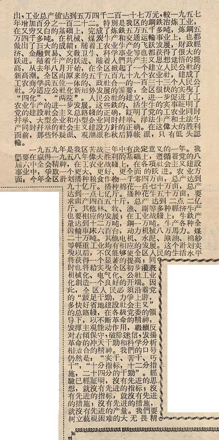 出,工业总产值达到五万四千二百一十七万元,较一九五七年增加百分之一百二十二。特别是我区的钢铁冶炼工业,在又穷又白的基础上,完成了炼铁五万五千多吨,炼钢五万四千多吨。在机械、煤炭生产和交通运输事业上,也都做出了巨大的成绩;随着工农业生产的飞跃发展,财政经济、金融贸易、文教卫生、科学事业等也都获得了很大的跃进。随着生产的跃进、随着人们思想觉悟的提高,从去年八月开始,在全区掀起了一个建立人民公社的新高潮。全区由原来的五千五百九十九个农业社,建成了工农商学兵五位一体的、政社合一的一百三十三个人民公社。为适应公社化新形势发展的需要,全区很快的实现了 “四化”、“两院”。人民公社的建立,进一步促进了工农业生产的进一步发展。这些铁的、活生生的实事证明了党的建设社会主义总路线的正确,证明了党的工业同时并举、大型企业和小型企业同时并举、洋法生产和土法生产同时并举的社会主义建设方针的正确。在这伟大的胜利面前,那些怀疑派、观潮派和秋后算账派,只有低头认输。